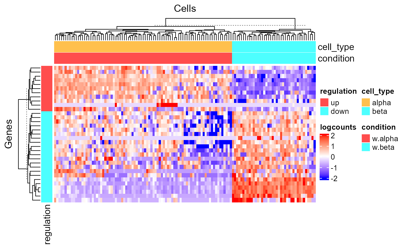 data("sceBatches") logcounts(sceBatches) <- log(counts(sceBatches) + 1) sce.w <- subsetSCECols(sceBatches, colData = "batch == 'w'") sce.w <- runWilcox(sce.w, class = "cell_type", classGroup1 = "alpha", groupName1 = "w.alpha", groupName2 = "w.beta", analysisName = "w.aVSb") plotDEGHeatmap(sce.w, "w.aVSb")
