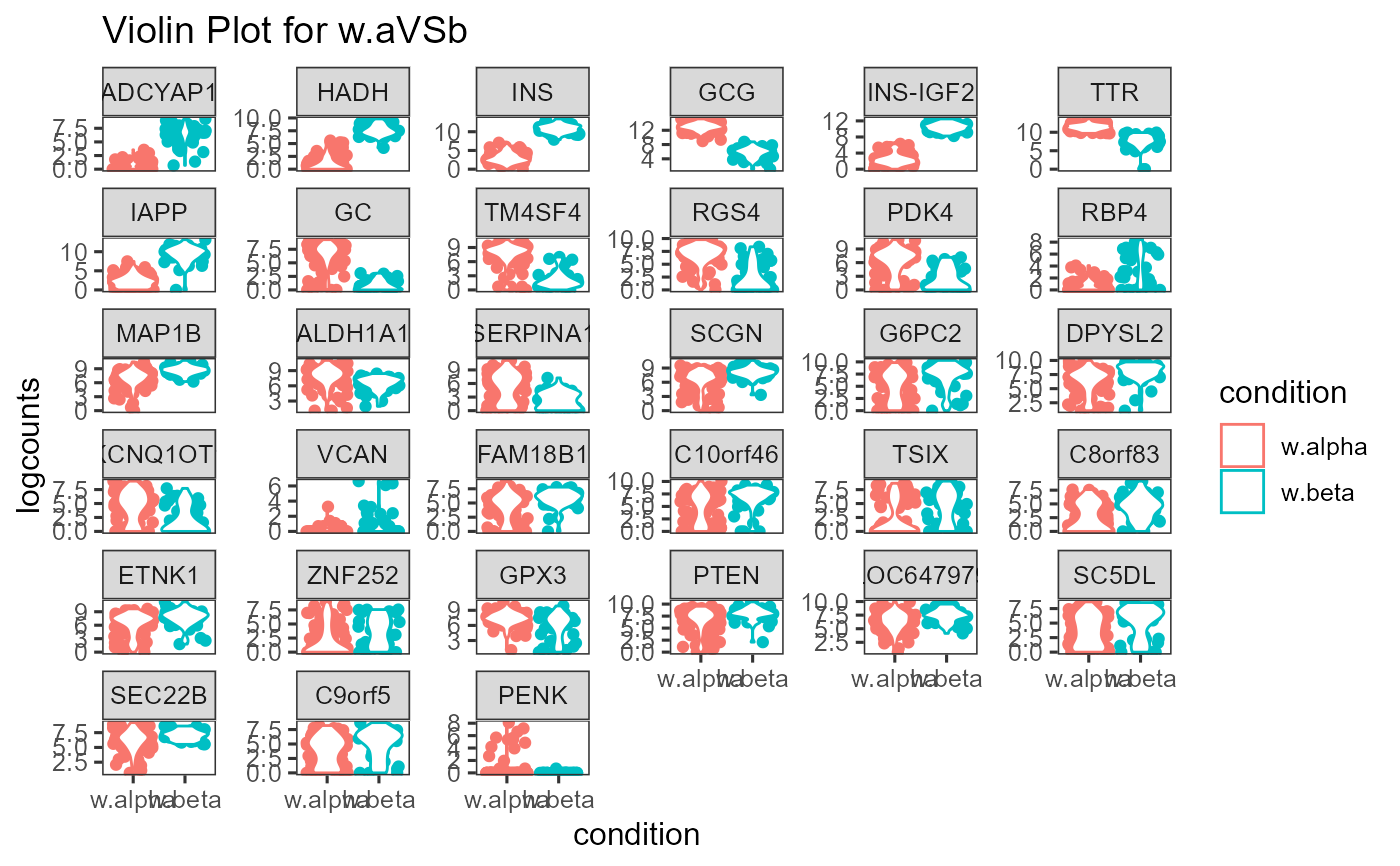 data("sceBatches") logcounts(sceBatches) <- log(counts(sceBatches) + 1) sce.w <- subsetSCECols(sceBatches, colData = "batch == 'w'") sce.w <- runWilcox(sce.w, class = "cell_type", classGroup1 = "alpha", groupName1 = "w.alpha", groupName2 = "w.beta", analysisName = "w.aVSb") plotDEGViolin(sce.w, "w.aVSb")