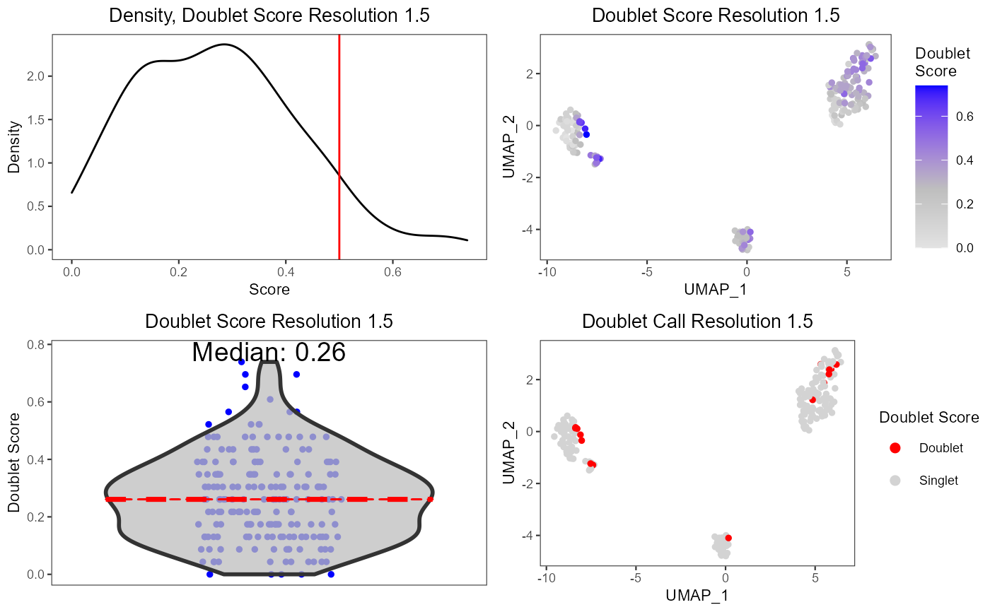 plotDoubletFinderResults( inSCE, sample = NULL, shape = NULL, groupBy = NULL, combinePlot = "all", violin = TRUE, boxplot = FALSE, dots = TRUE, reducedDimName = NULL, xlab = NULL, ylab = NULL, dim1 = NULL, dim2 = NULL, bin = NULL, binLabel = NULL, defaultTheme = TRUE, dotSize = 1, summary = "median", summaryTextSize = 3, transparency = 1, baseSize = 15, titleSize = NULL, axisLabelSize = NULL, axisSize = NULL, legendSize = NULL, legendTitleSize = NULL, relHeights = 1, relWidths = c(1, 1, 1), plotNCols = NULL, plotNRows = NULL, labelSamples = TRUE, samplePerColumn = TRUE, sampleRelHeights = 1, sampleRelWidths = 1 )