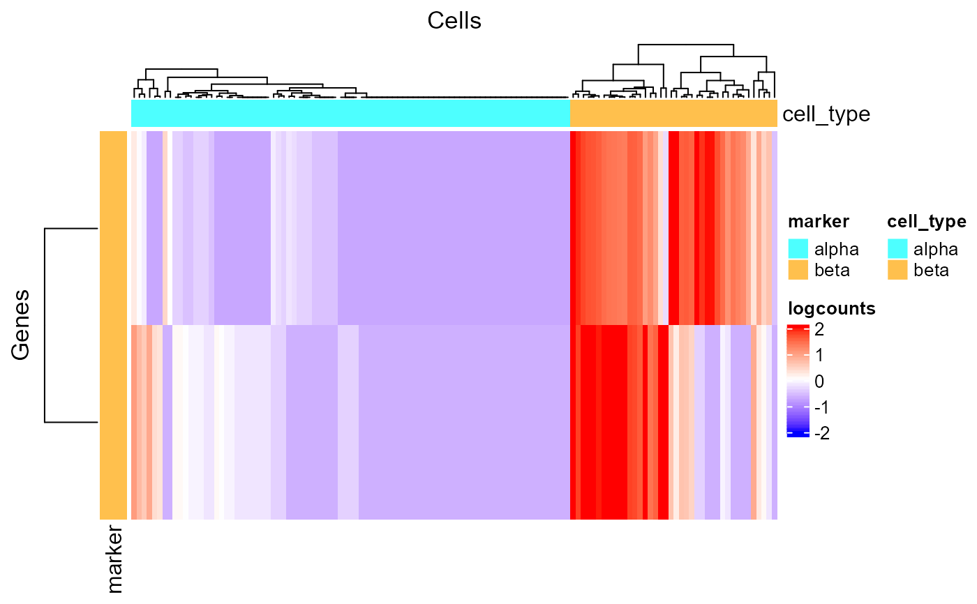 data("sceBatches") logcounts(sceBatches) <- log(counts(sceBatches) + 1) sce.w <- subsetSCECols(sceBatches, colData = "batch == 'w'") sce.w <- findMarkerDiffExp(sce.w, method = "wilcox", cluster = "cell_type")#>#>#>plotMarkerDiffExp(sce.w)