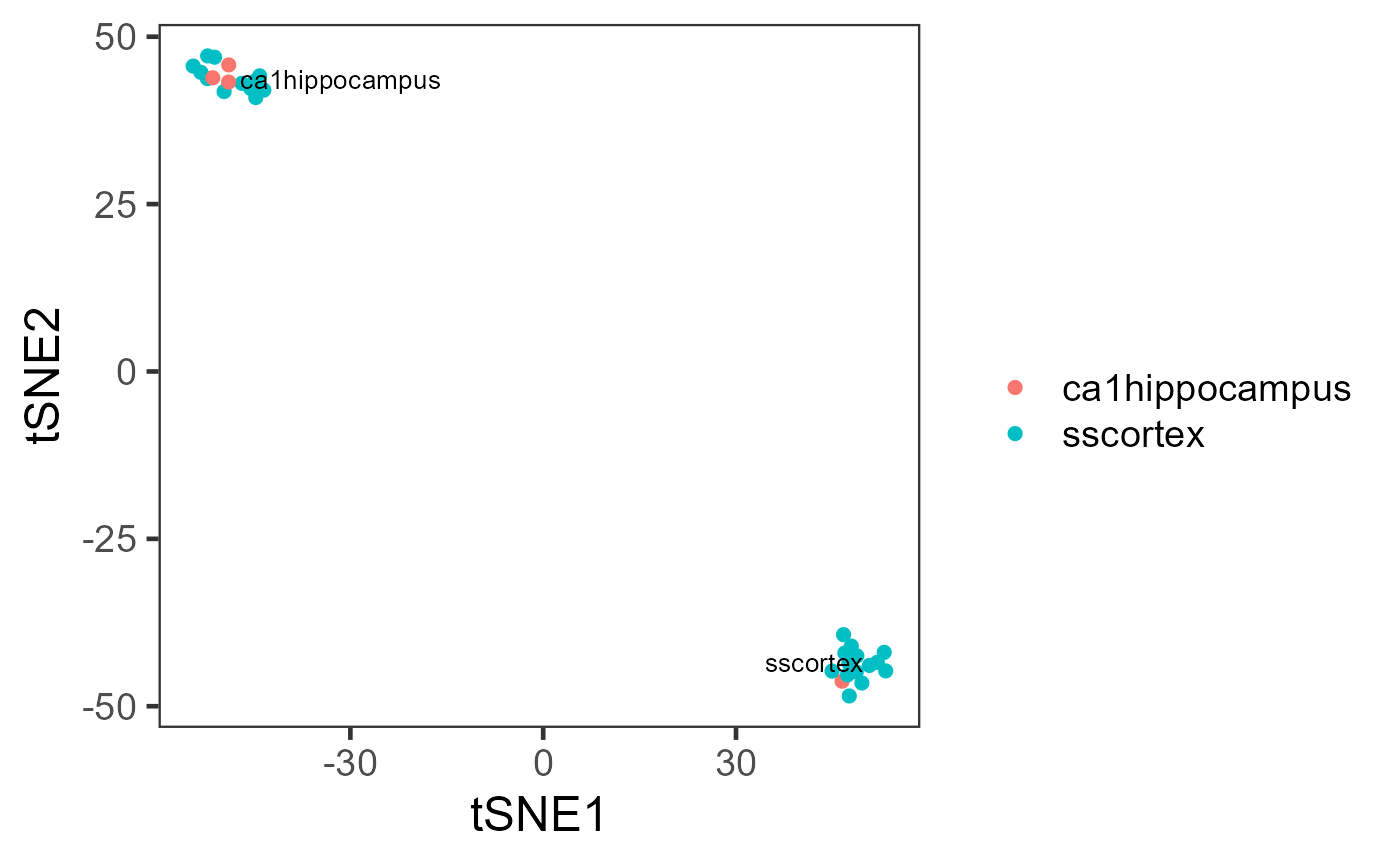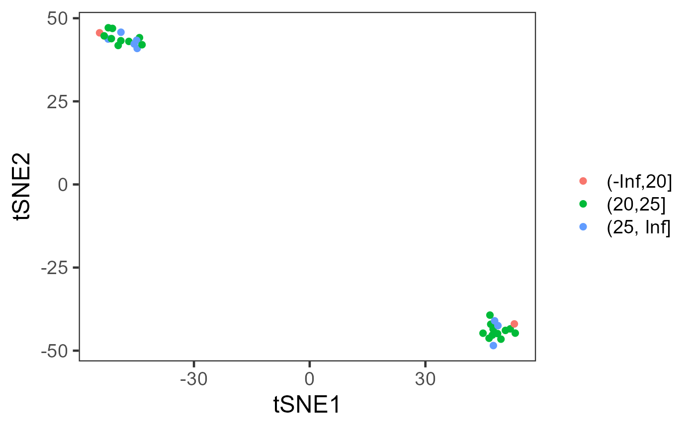 plotSCEDimReduceColData( inSCE = mouseBrainSubsetSCE, colorBy = "tissue", shape = NULL, conditionClass = "factor", reducedDimName = "TSNE_counts", xlab = "tSNE1", ylab = "tSNE2", labelClusters = TRUE )plotSCEDimReduceColData( inSCE = mouseBrainSubsetSCE, colorBy = "age", shape = NULL, conditionClass = "numeric", reducedDimName = "TSNE_counts", bin = c(-Inf, 20, 25, +Inf), xlab = "tSNE1", ylab = "tSNE2", labelClusters = FALSE )