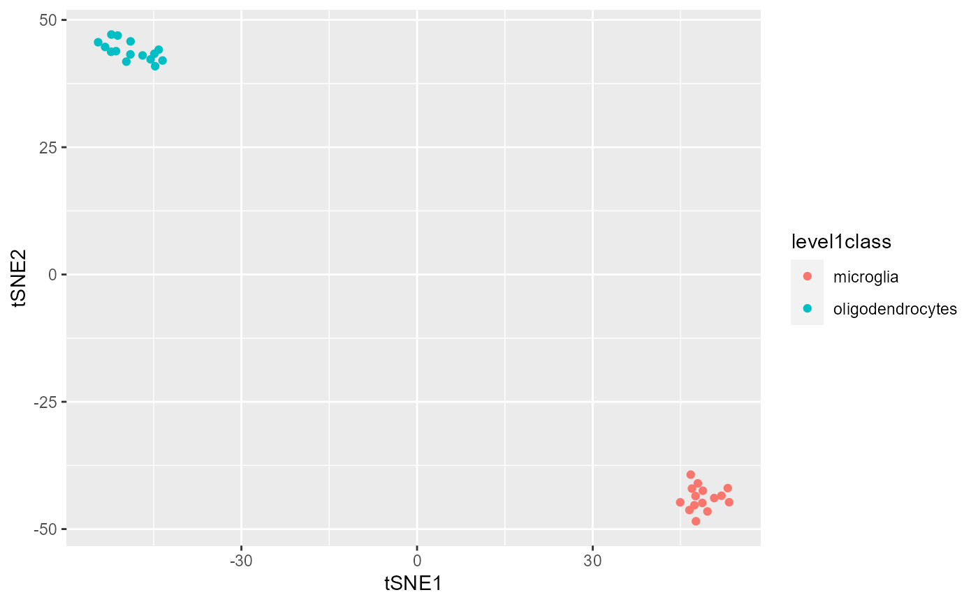data("mouseBrainSubsetSCE") plotTSNE(mouseBrainSubsetSCE, colorBy = "level1class", reducedDimName = "TSNE_counts")