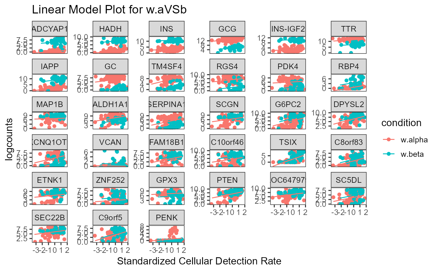 data("sceBatches") logcounts(sceBatches) <- log(counts(sceBatches) + 1) sce.w <- subsetSCECols(sceBatches, colData = "batch == 'w'") sce.w <- runWilcox(sce.w, class = "cell_type", classGroup1 = "alpha", groupName1 = "w.alpha", groupName2 = "w.beta", analysisName = "w.aVSb") plotDEGRegression(sce.w, "w.aVSb")