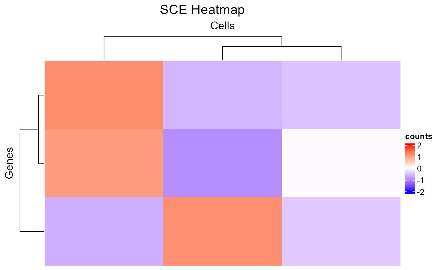 plotSCEHeatmap( inSCE, useAssay = "logcounts", doLog = FALSE, featureIndex = NULL, cellIndex = NULL, scale = TRUE, trim = c(-2, 2), featureIndexBy = "rownames", cellIndexBy = "rownames", rowDataName = NULL, colDataName = NULL, featureAnnotations = NULL, cellAnnotations = NULL, featureAnnotationColor = NULL, cellAnnotationColor = NULL, rowSplitBy = NULL, colSplitBy = NULL, rowLabel = FALSE, colLabel = FALSE, rowLabelSize = 8, colLabelSize = 8, rowDend = TRUE, colDend = TRUE, title = "SCE Heatmap", rowTitle = "Genes", colTitle = "Cells", rowGap = grid::unit(0, "mm"), colGap = grid::unit(0, "mm"), border = FALSE, colorScheme = NULL, ... )