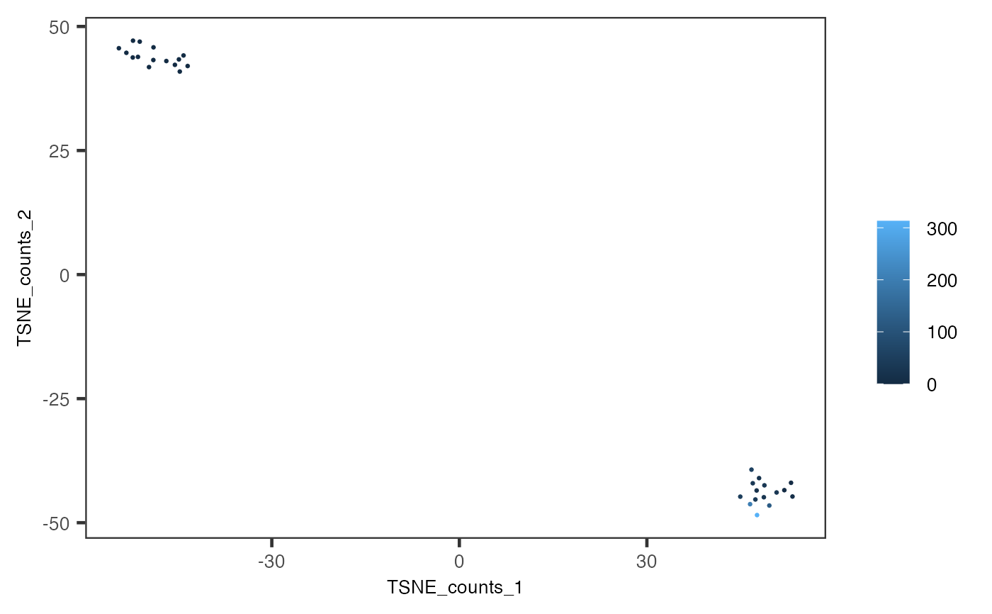 data("mouseBrainSubsetSCE") plotSCEScatter( inSCE = mouseBrainSubsetSCE, legendTitle = NULL, slot = "assays", annotation = "counts", feature = "Apoe", reducedDimName = "TSNE_counts", labelClusters = FALSE )