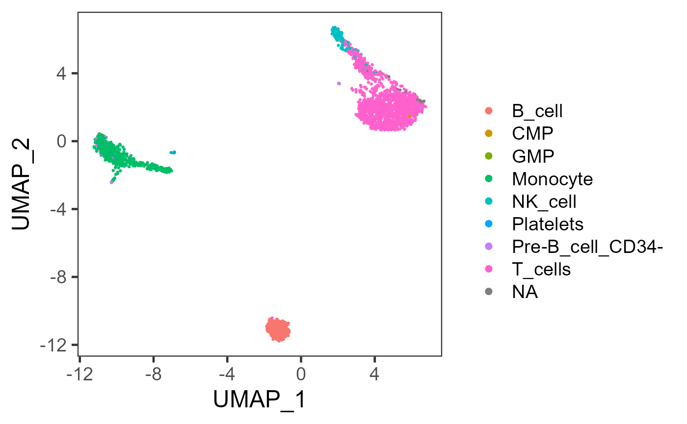 Then users can use runSingleR() to invoke the algorithm. Here we choose to use useBltinRef = "hpca" to set the reference, which refers to Human Primary Cell Atlas Data [2] and this will be automatically cached to users’ local. We set level = "main" to label the PBMC3k dataset with general cell types. Users can also set it to "fine" for more subtypes, and "ont" for Gene Ontology information. For more information, please click on the function name and see the reference page of this function.