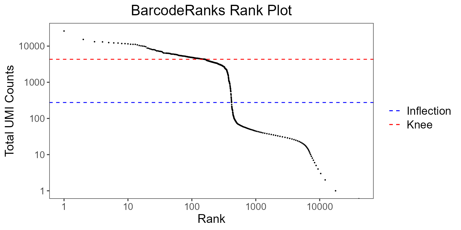 The total UMI count of each barcode is plotted against its rank. We can see a steep dropoff of UMI counts around the inflection point, where we see a presumed separation between cell-containing and empty droplets.