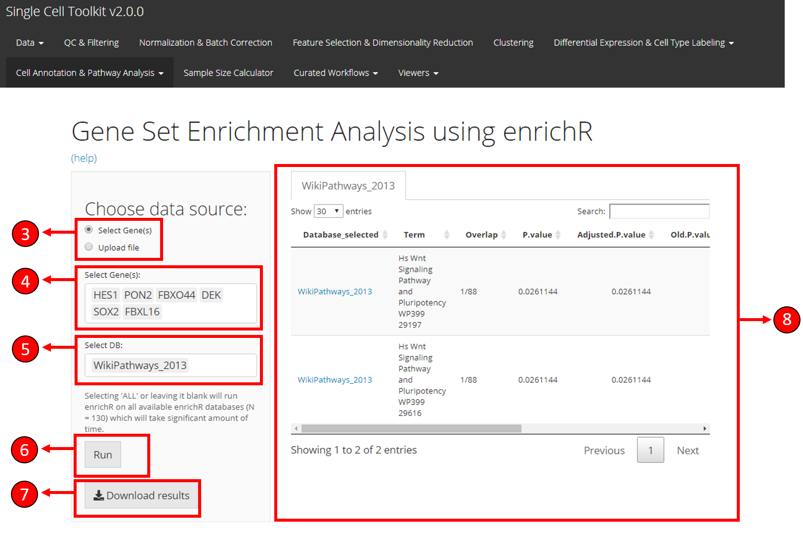 To view detailed instructions on how to use the method from the toolkit, please select ‘Interactive Analysis’ for using enrichR in shiny application or ‘Console Analysis’ for using this method on R console from the tabs below: