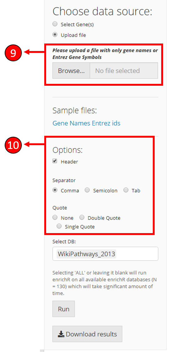 If Upload file option is selected in (3), additional options are displayed to upload the gene symbols file. The file path can be selected here.