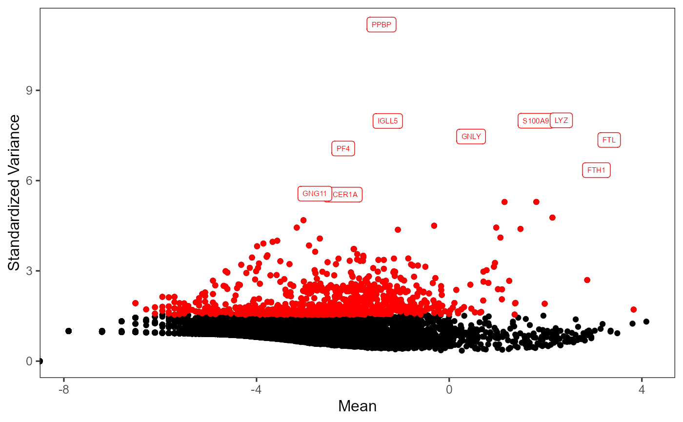 1. Compute statistics for the highly variable genes using the wrapper function runFeatureSelection as below: