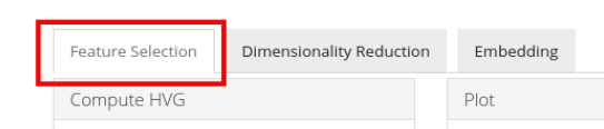3. The Feature Selection sub-tab is divided into three panels namely, a) Compute HVG, b) Select and Subset, and c) Plot.