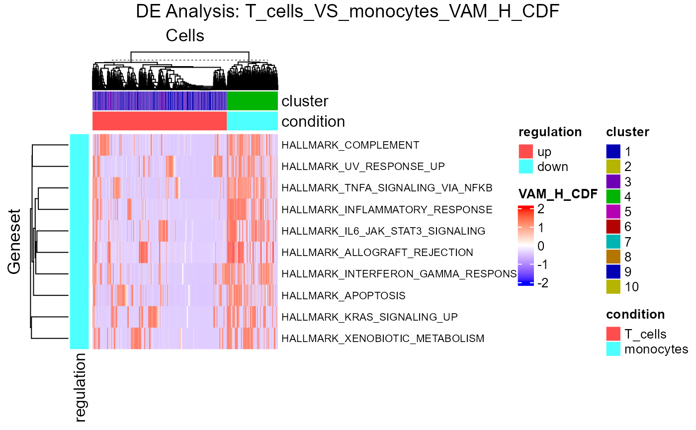 plotDEGHeatmap(sce, useResult = "T_cells_VS_monocytes_VAM_H_CDF",