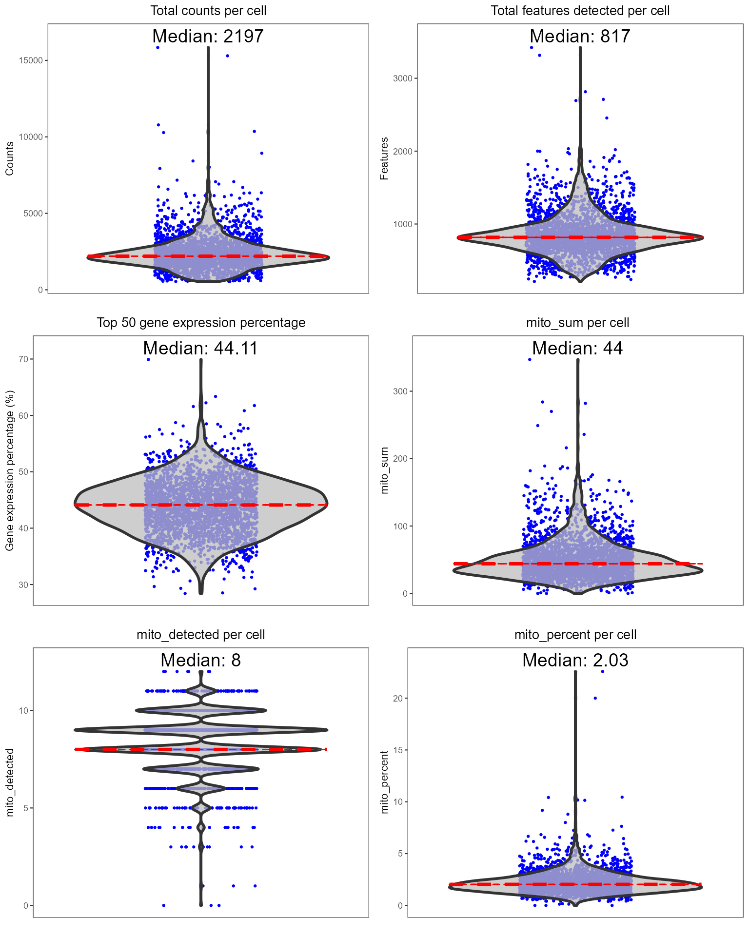 matrixFileNames = "matrix.mtx")Quality control and filtering of cells is often needed before down-stream analyses such as dimensionality reduction and clustering. Typical filtering procedures include exclusion of poor quality cells with low numbers of counts/UMIs, estimation and removal of ambient RNA, and identification of potential doublet/multiplets. Many tools and packages are available to perform these operations and users are free to apply their tool(s) of choice.