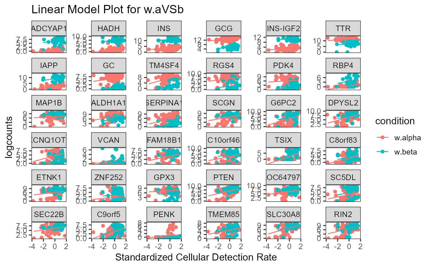 sce.w <- runWilcox(sce.w, class = "cell_type", classGroup1 = "alpha",