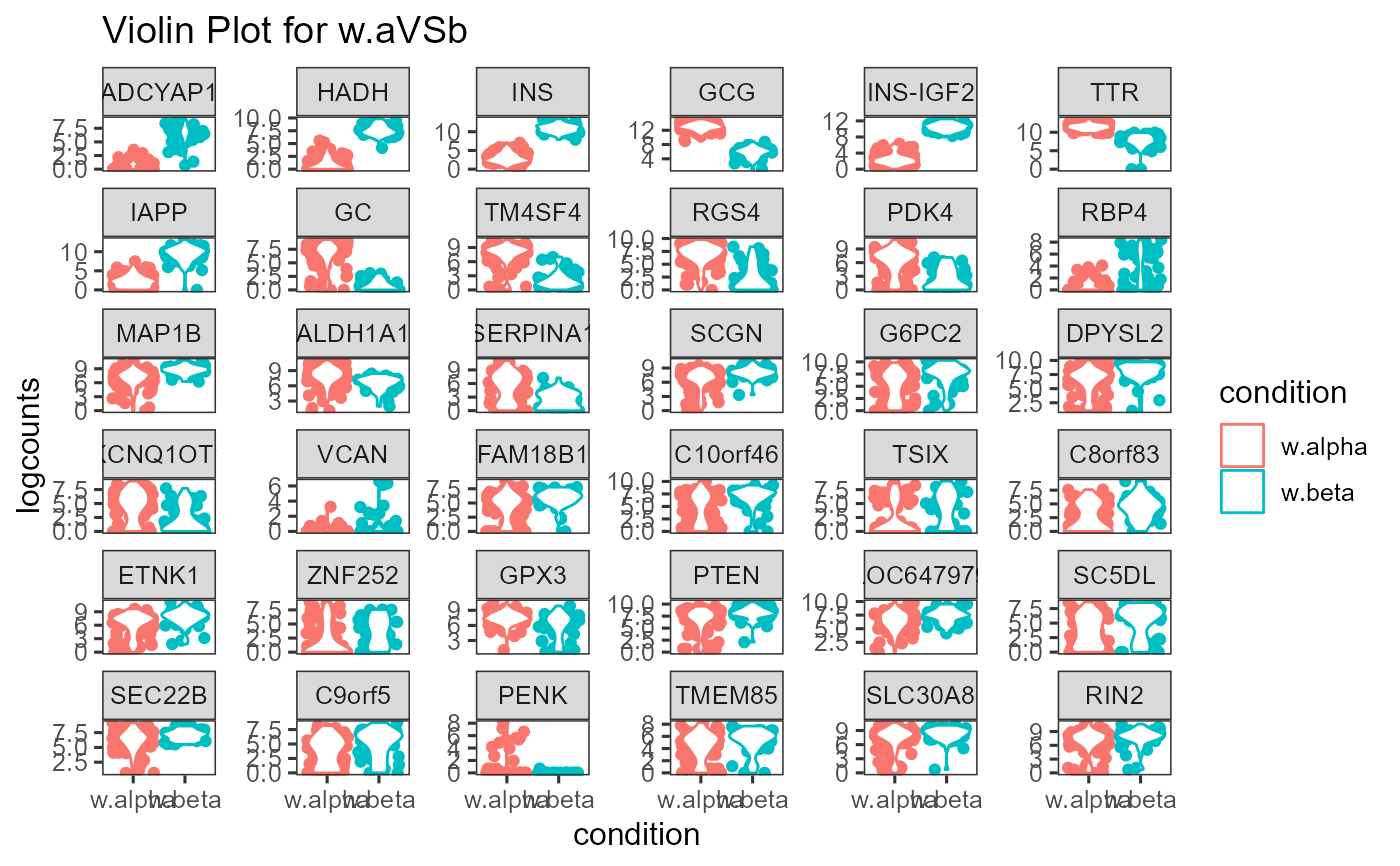 sce.w <- runWilcox(sce.w, class = "cell_type", classGroup1 = "alpha",