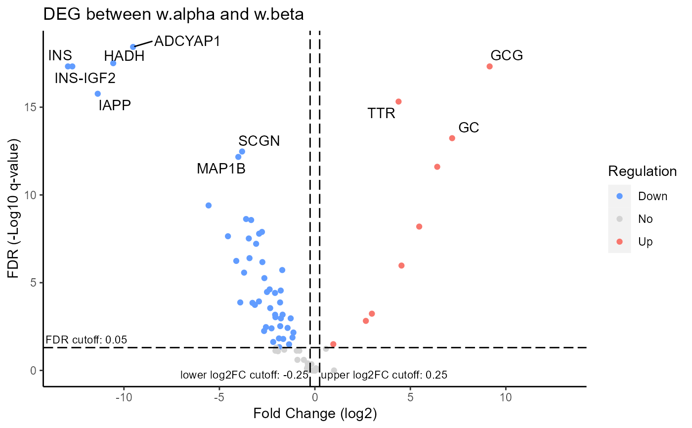 sce.w <- runWilcox(sce.w, class = "cell_type", classGroup1 = "alpha",