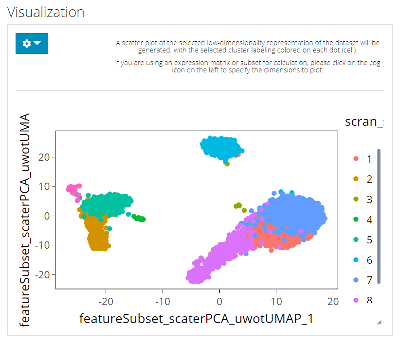 The visualization is implemented with a plotting of a chosen low-dimension embedding, colored with a chosen cluster assignment (the newly generated result by default). SCTK by default uses the matrix used for clustering calculation for the visualization. However, usually, users might use a PCA for clustering while needing a UMAP/t-SNE embedding for visualization. To change the embedding used, please click on the blue settings (cog) button on the left-top corner.