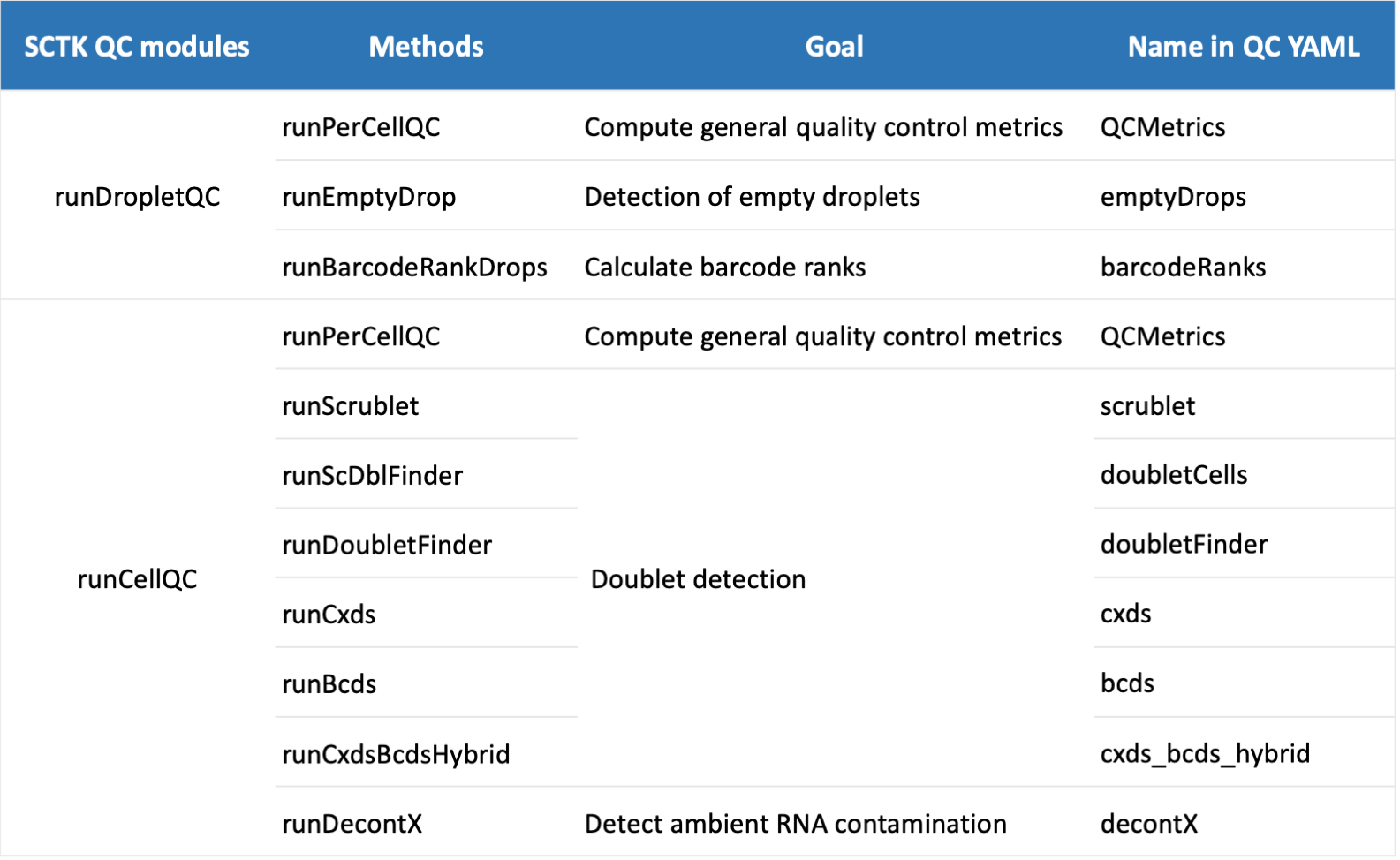 Users can specify parameters for QC algorithms in this pipeline with a YAML file (supplied with -y/--yamlFile argument). The current supported QC algorithms including doublet detection (bcds, cxds, cxds_bcds_hybrid, doubletFinder, doubletCells and scrublet), decontamination (decontX), emptyDrop detection (emptyDrops) and barcodeRankDrops (barcodeRanks). A summary of each function is shown below: