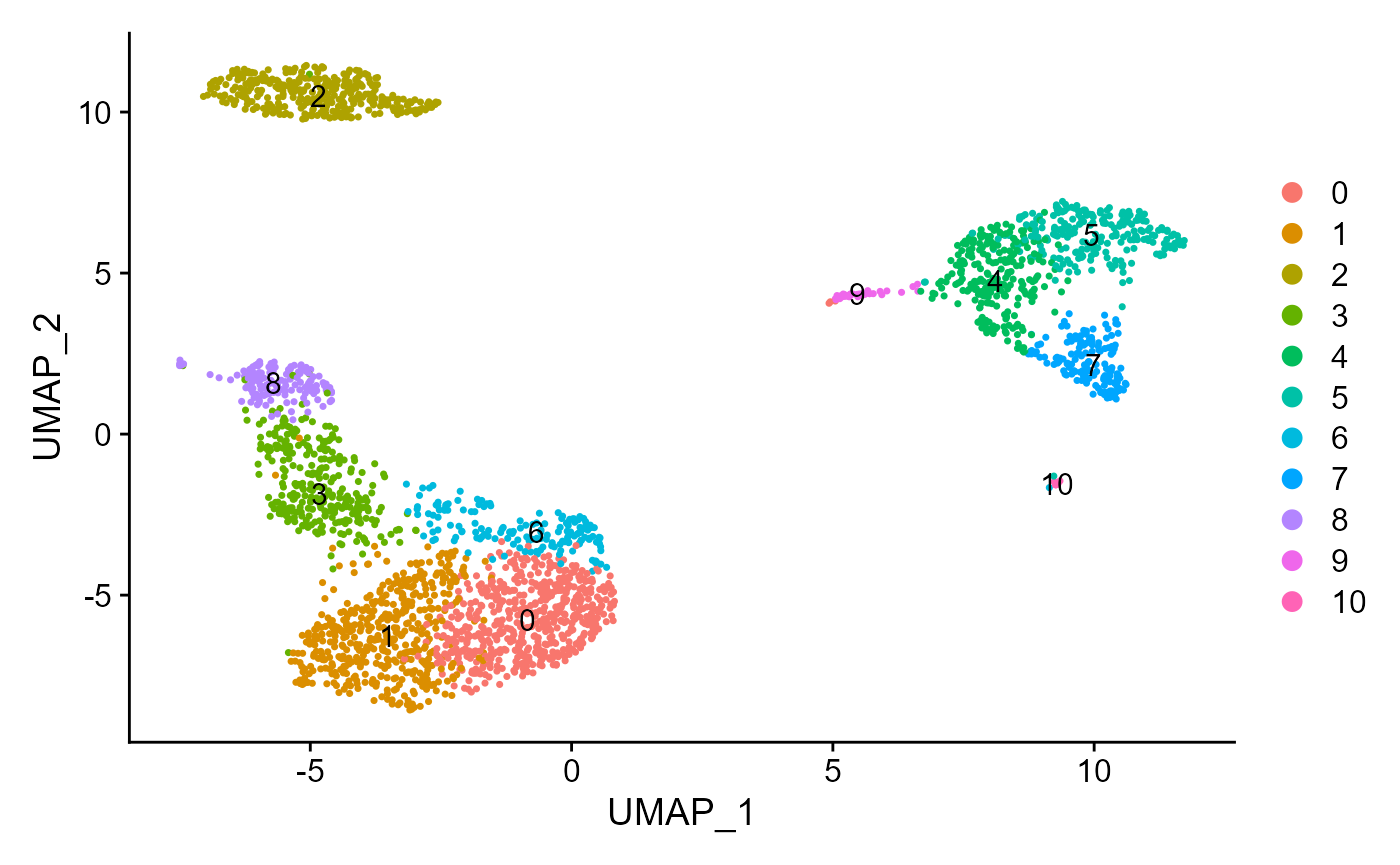 sce <- runSeuratFindClusters(inSCE = sce, useAssay = "seuratScaledData", useReduction = "pca", dims = 10, algorithm = "louvain")## Modularity Optimizer version 1.3.0 by Ludo Waltman and Nees Jan van Eck