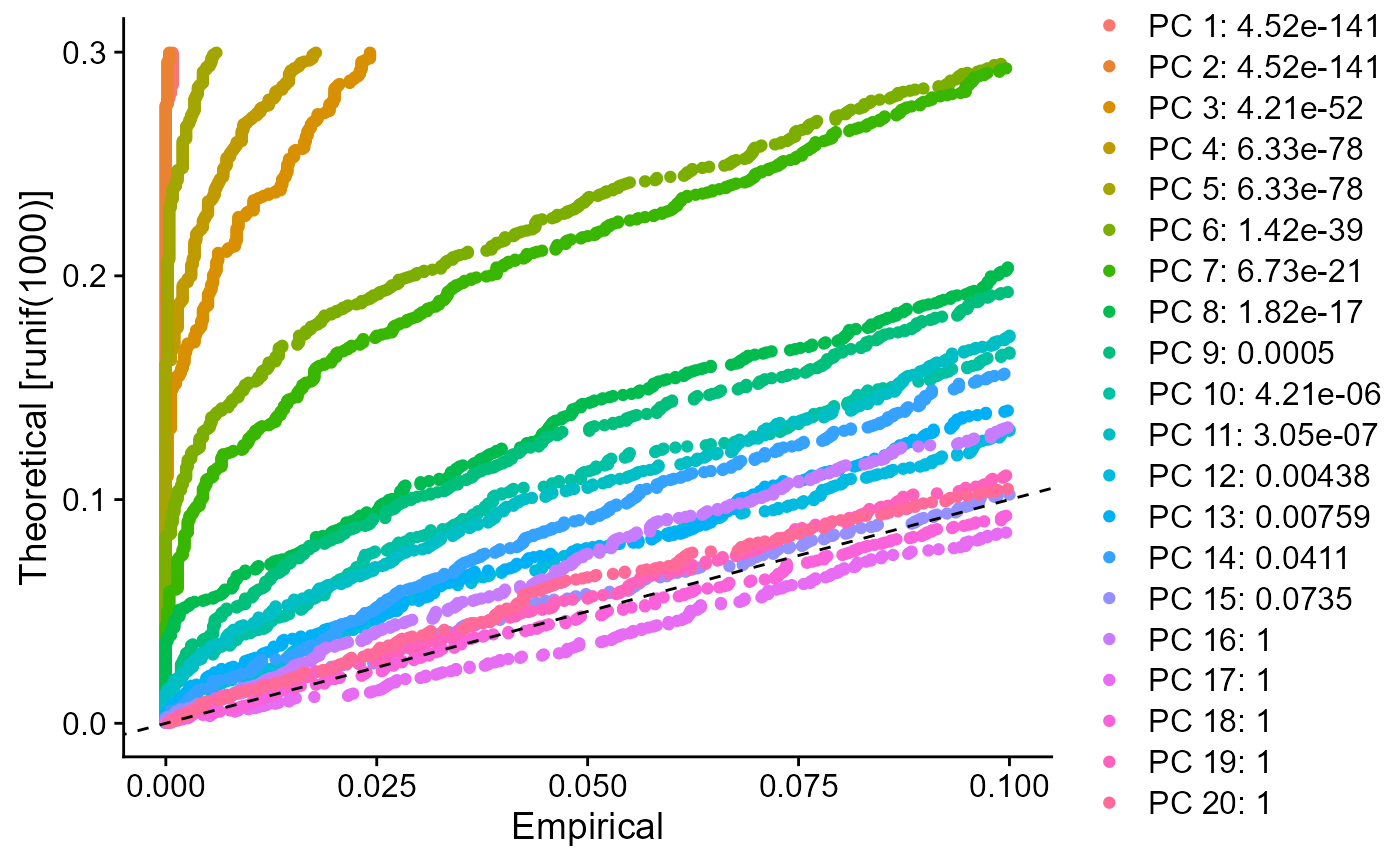 sce <- runSeuratJackStraw(inSCE = sce, useAssay = "seuratScaledData", dims = 20)