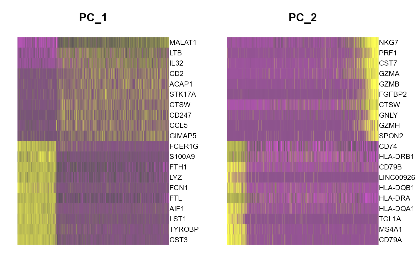 runSeuratHeatmap(inSCE = sce, useAssay = "seuratScaledData", useReduction = "pca", nfeatures = 20, dims = 2)