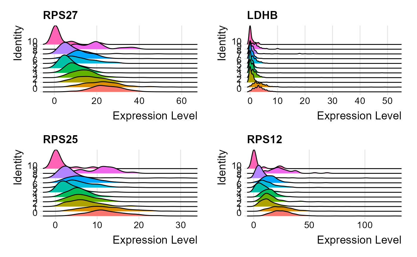 plotSeuratGenes(inSCE = sce, scaledAssayName = "seuratScaledData", plotType = "ridge", features = metadata(sce)[["seuratMarkers"]]$gene.id[1:4], groupVariable = "Seurat_louvain_Resolution0.8", ncol = 2, combine = TRUE)
