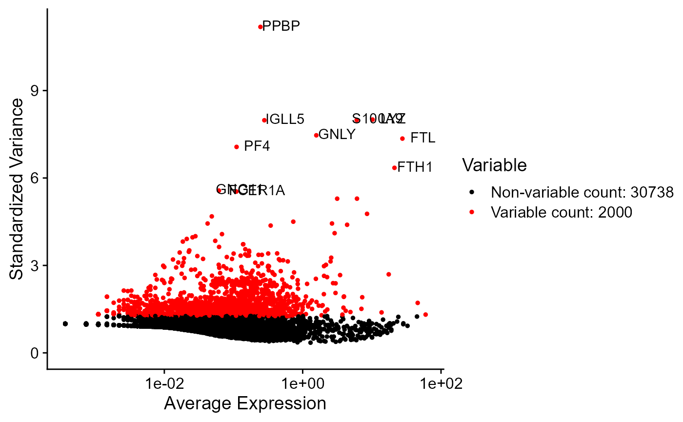 print(getTopHVG(inSCE = sce, method = "vst", n = 10))## [1] "PPBP" "LYZ" "S100A9" "IGLL5" "GNLY" "FTL" "PF4" "FTH1"