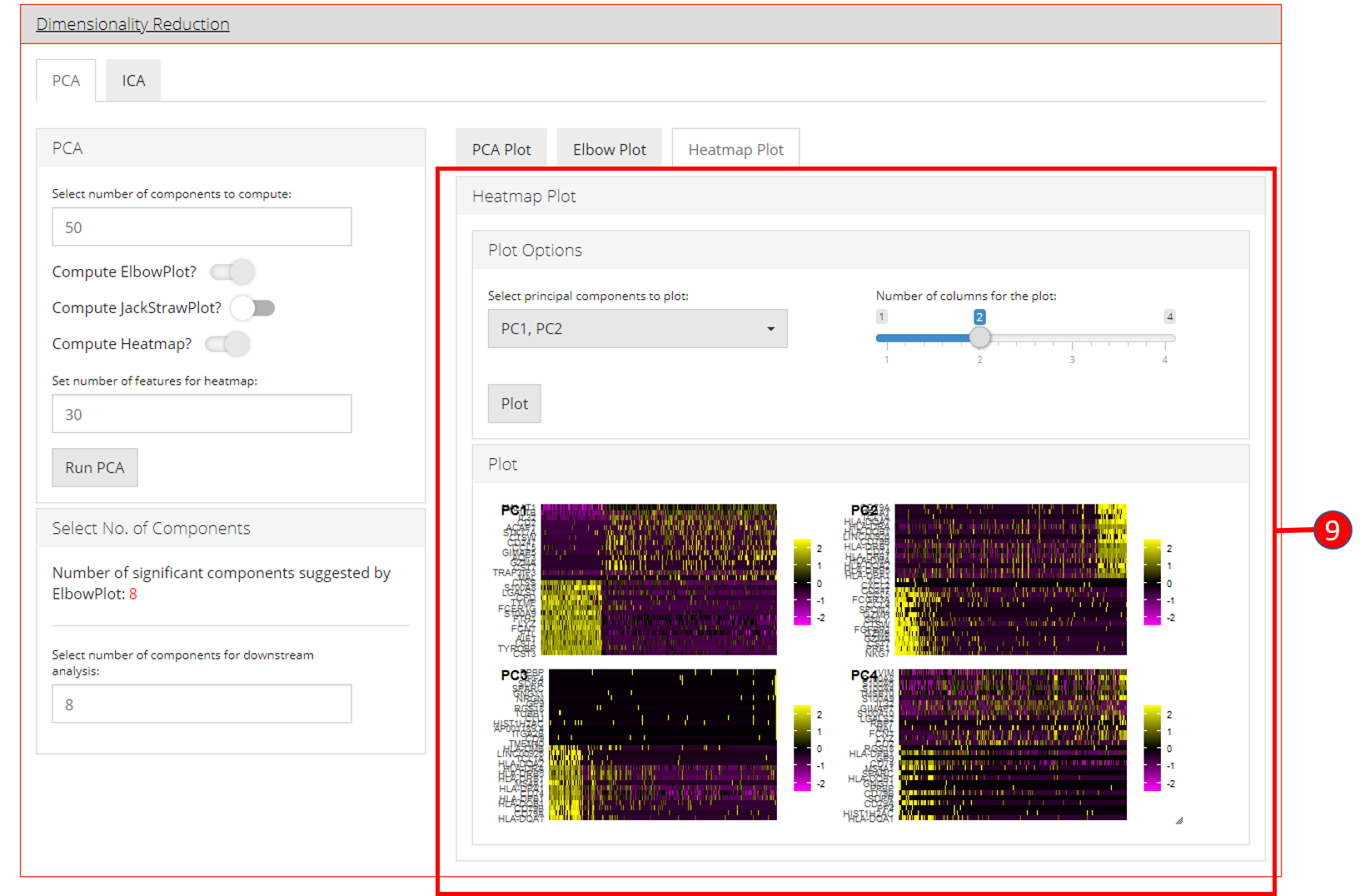 vst, mean.var.plot and dispersion.2000.4. Dimensionality Reduction Seurat workflow offers PCA or ICA for dimensionality reduction and the components from these methods can be used in the downstream analysis. Moreover, several plots are available for the user to inspect the output of the dimensionality reduction such as the standard ‘PCA Plot,’ ‘Elbow Plot,’ ‘Jackstraw Plot’ and ‘Heatmap Plot.’