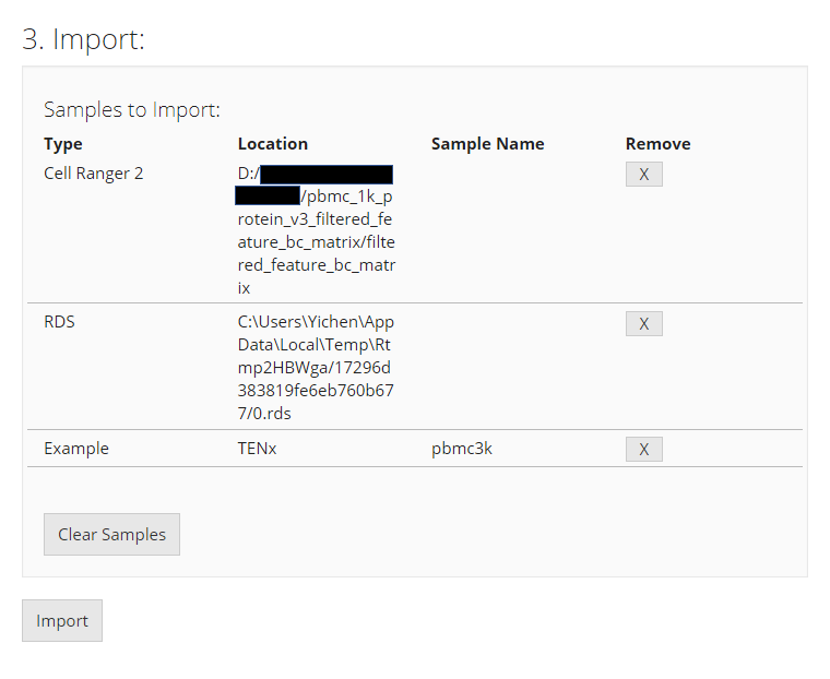 After successfully choosing each source of dataset, it will be inserted to a new line of the table at the buttom of this UI page, in “3. Import” section. This is a wait-list for all the samples of interests. To finally import all datasets of interests, users must click on “Import” button.