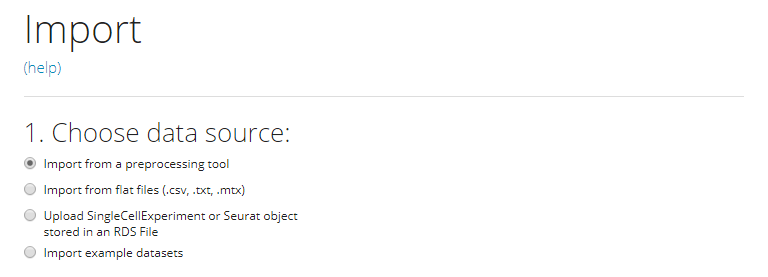 This page is the landing page of the SCTK UI application. Here SCTK allows users to import multiple datasets at once, and the datasets can be in various forms, as listed above. SCTK also provides online example datasets.