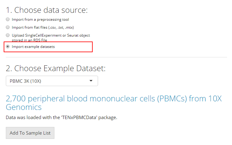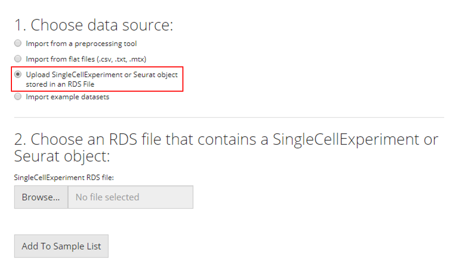 SingleCellExperiment or Seurat Object in an RDS fileRDS is a file format that stores a single object from R environment. To import a single-cell dataset stored in a SingleCellExperiment (SCE) object from an RDS file, the user can simply select which RDS file to import and click “Add to Sample List”.