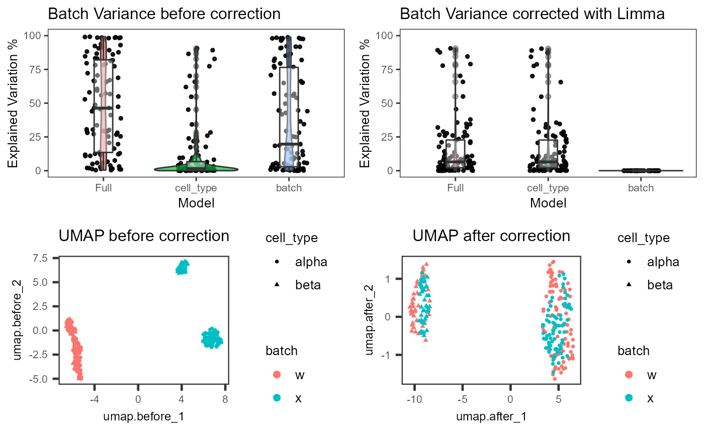 Four plots will be combined. Two of them are violin/box-plots for percent variance explained by the batch variation, and optionally the covariate, for original and corrected. The other two are UMAPs of the original assay and the correction result matrix. If SCTK batch correction methods are performed in advance, this function will automatically detect necessary input. Otherwise, users can also customize the input. Future improvement might include solution to reduce redundant UMAP calculation.