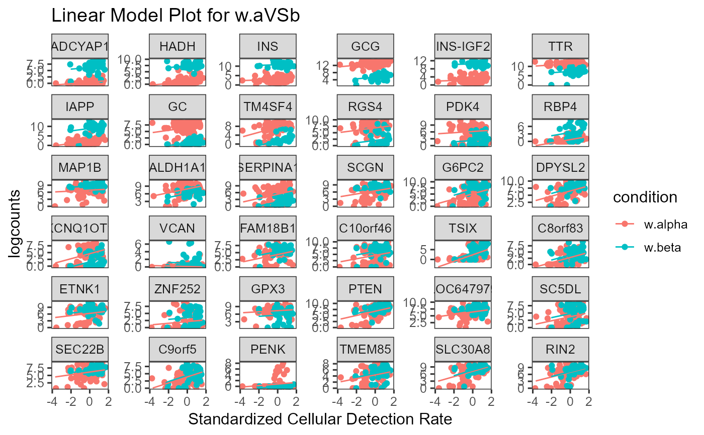 sce.w <- runWilcox(sce.w, class = "cell_type", classGroup1 = "alpha",
