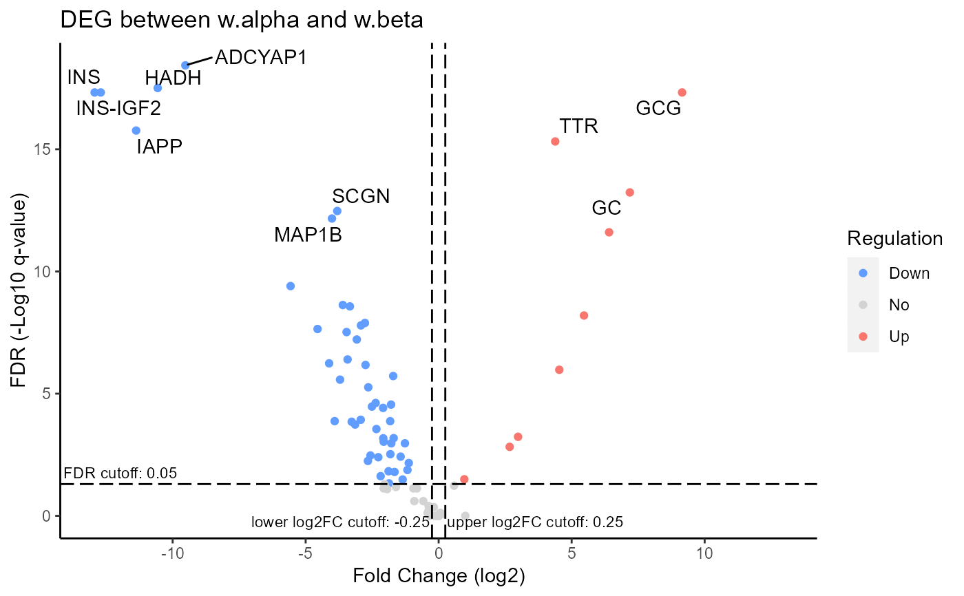 sce.w <- runWilcox(sce.w, class = "cell_type", classGroup1 = "alpha",